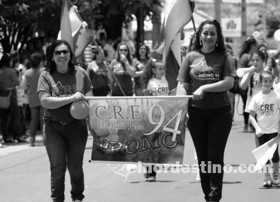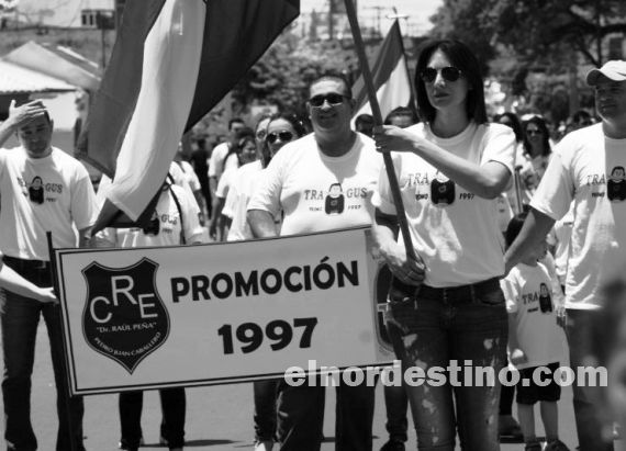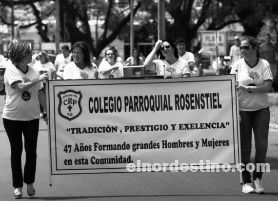 El desfile anual de ex alumnos del Colegio Parroquial Rosenstiel y del C.R.E. “Dr. Raúl Peña” fue sin dudas el momento de mayor convocatoria y colorido que se realizó para celebrar el cumpleaños 114 de la ciudad. Foto: Diego Lozano.