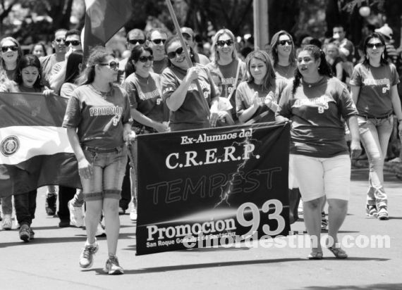 Una multitud de ex alumnos de los colegios más representativos dePedro Juan Caballero desfiló por la calle Carlos Antonio López, como alguna vez en el tiempo lo hicieron en conmemoración del 14 de Mayo. Foto: Diego Lozano.