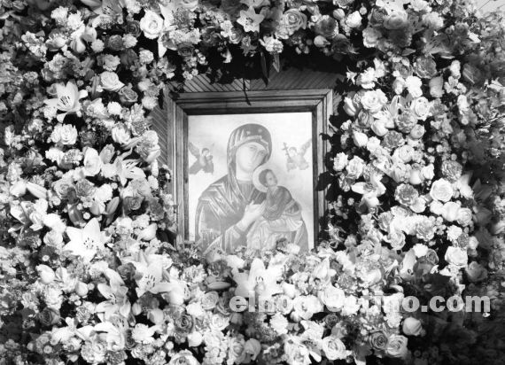 El ícono de la Virgen, pintado sobre madera, de veintiuna por diecisiete pulgadas, muestra a la Madre con el Niño Jesús. El Niño observa a dos ángeles que le muestran los instrumentos de su futura pasión. Foto: Diego Lozano.