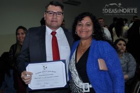 Juliana Ramos Montanía recibe su certificado del Curso de Especialista en Ventas de manos de la licenciada Marta Graciela Vargas Monzón y su kit de trabajo de parte del diputado Juancho Acosta. (Foto: Diego Lozano para Ideas del Norte Consultora Publicitaria).